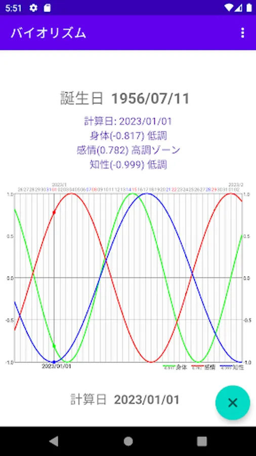 Based on the date of birth, calculate the person's biorhythm.
