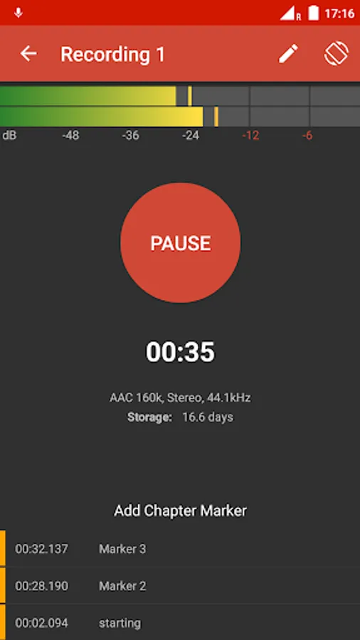 Our recording interface displays the current maximum peak level, available recording time, you can add and edit chapter markers and it also records in background while using other apps.
