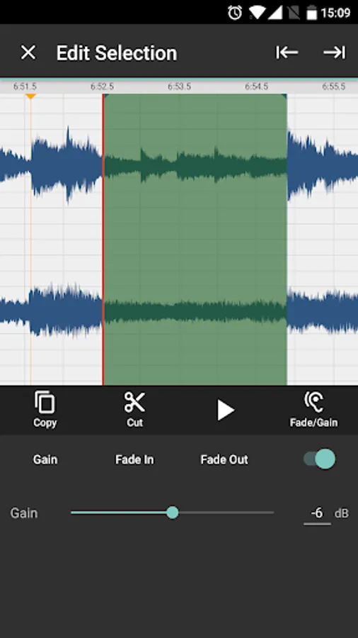 - Adjust volume gain of selections, add fade in/out etc.