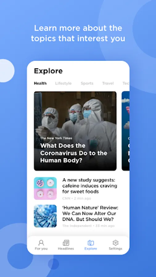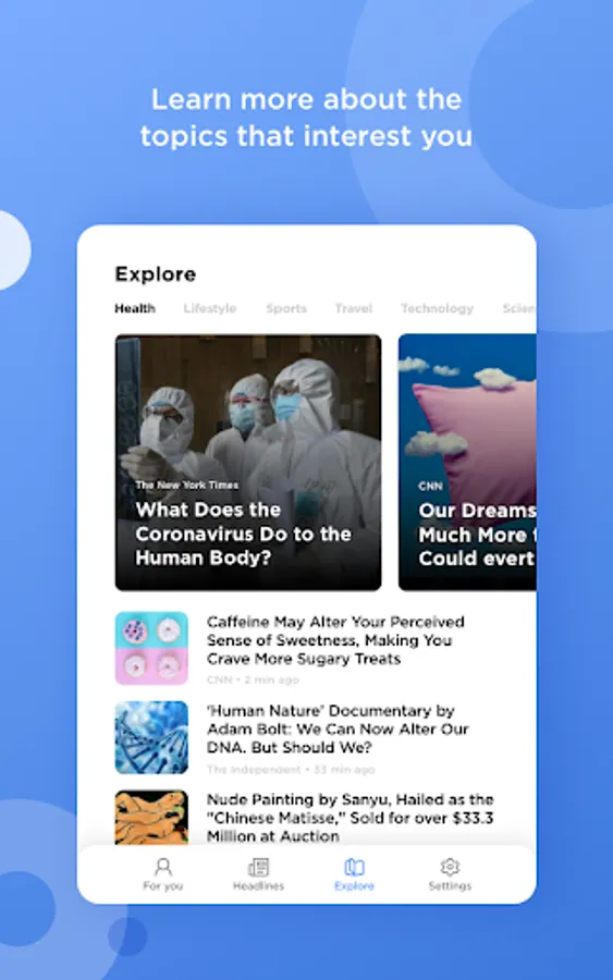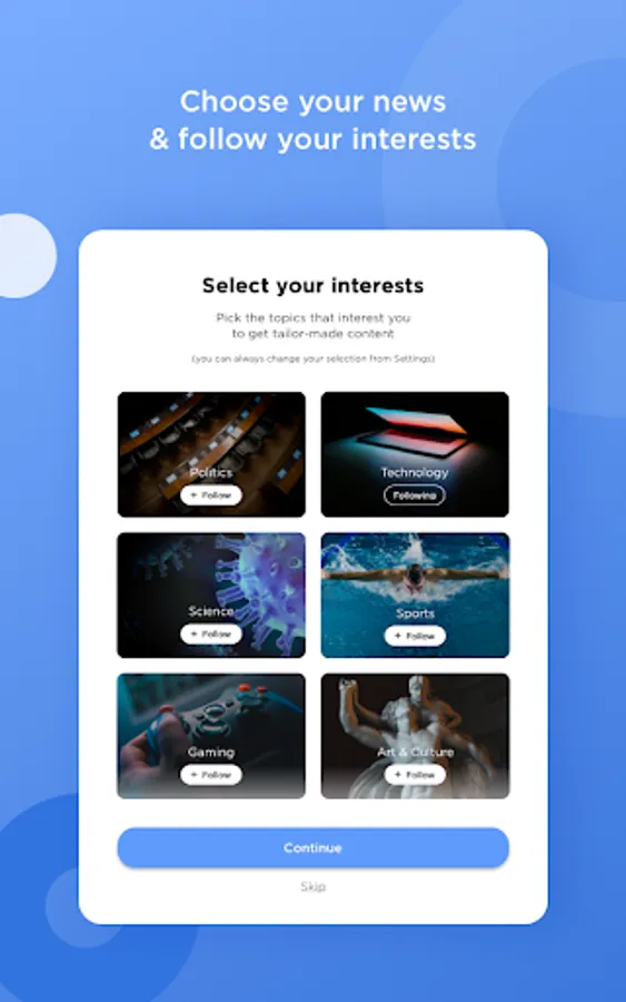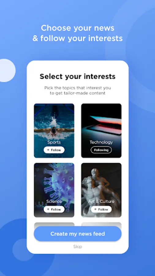 * Choose your news: Select the topics that interest you to customise your news feed with handpicked articles especially for you.