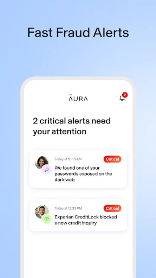 Our award-winning technology¹ provides all-in-one security & protection by monitoring and alerting you if your identitiy, data, passwords, credit, and financial accounts are at risk. Aura alerts you to credit fraud up to 250x faster than the competition.² Aura’s protection & security helps stop threats before they strike.