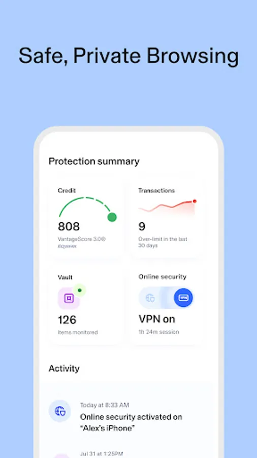 Protect your identity while shopping, banking, and browsing with our easy-to-use VPN. Also blocks millions of malicious (e.g., malware, phishing) sites and online threats that may steal your info, providing added security.