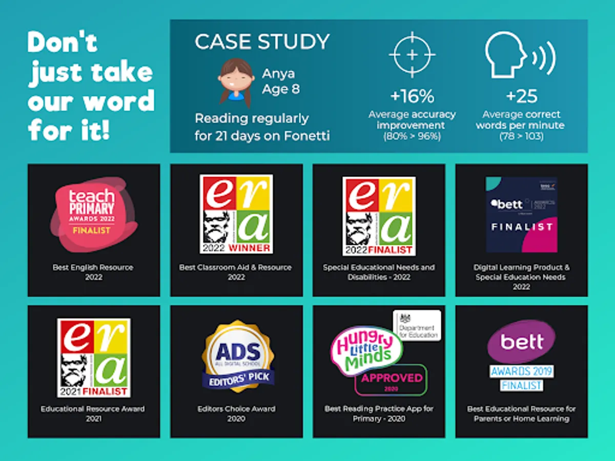 Works across multiple accents: Fonetti works with a vast range of accents including where English is an additional language and it is used around the world for the practice of English as well as improving general reading skills.