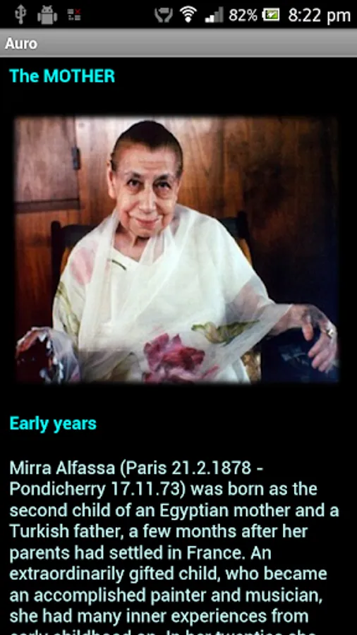 The Mother was born Mirra Alfassa in Paris on 21 February 1878. A pupil at the Academie Julian, she became an accomplished artist, and also excelled as a pianist and writer. Interested in occultism, she visited Tlemcen, Algeria, in 1905 and l906 to study with the adept Max Theon and his wife. Her primary interest, however, was spiritual development. In Paris she founded a group of spiritual seekers and gave talks to various groups.