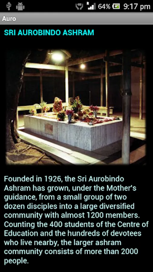 Founded in 1926, the Sri Aurobindo Ashram has grown, under the Mother's guidance, from a small group of two dozen disciples into a large diversified community with almost 1200 members. Counting the 400 students of the Centre of Education and the hundreds of devotees who live nearby, the larger ashram community consists of more than 2000 people.Situated in a busy city of over 700,000 people, the Ashram is not a quiet place of retreat but a vibrant centre of life in a modern urban setting. The dynamic character of the community reflects the life-affirming aim of Sri Aurobindo's Yoga.
