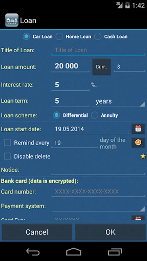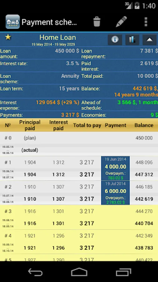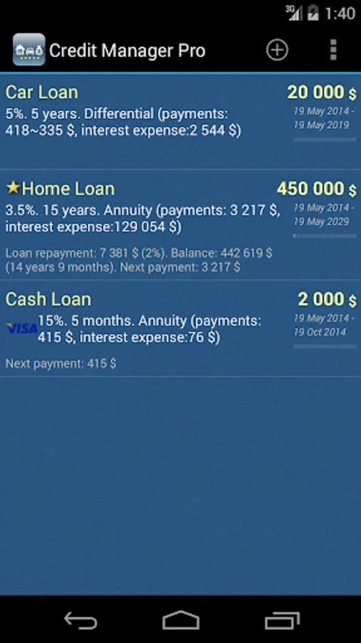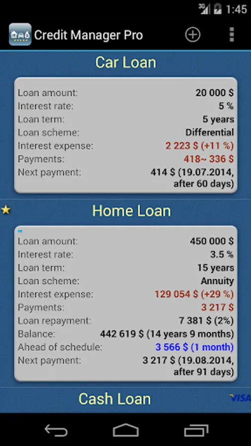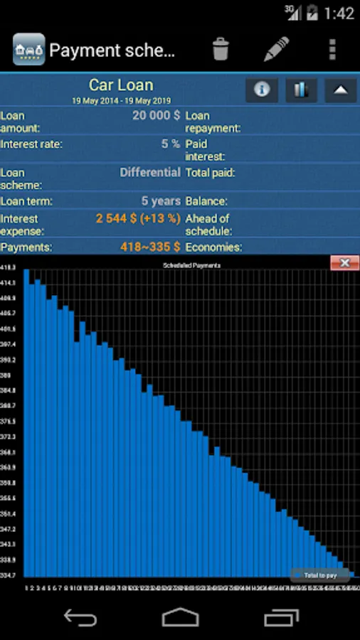 Credit Manager will calculate the payment schedule, and will calculate the outstanding balance of the loan. You will always know how much you have left to pay and how much you are ahead of schedule.