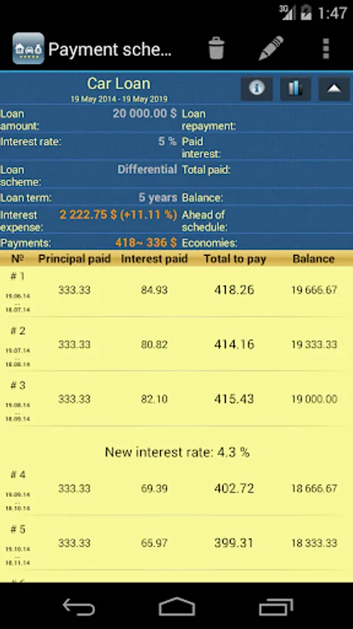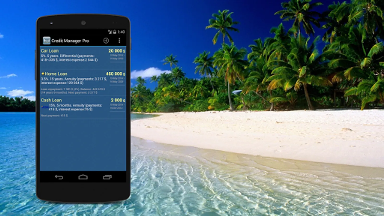Credit Manager will calculate the payment schedule, and will calculate the outstanding balance of the loan. You will always know how much you have left to pay and how much you are ahead of schedule.