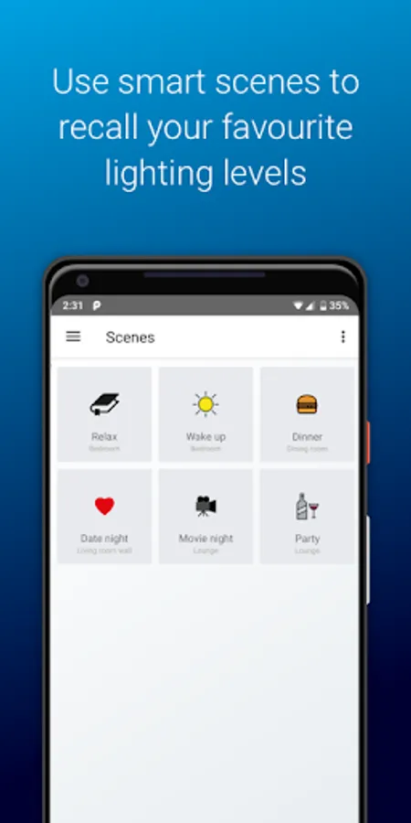 You can save the current settings of all your Devices in a Space as a Scene that can be recalled again and again. By saving a set of Scenes you can quickly and easily set your Devices to your mood.