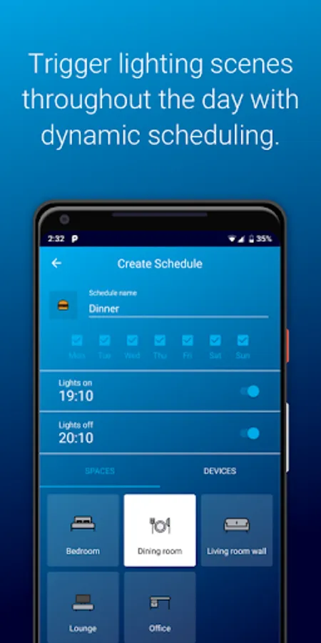 You can use the AOne App to turn on, turn off and dim your lights as well as being able to add your lights to spaces and setting schedules for individual lights or groups of lights. Lights can be programmed at certain times and help manage everything from the mood in a room whilst watching a movie to providing peace of mind when you’re not at home.