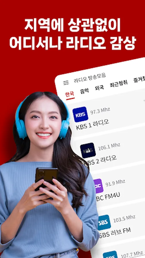 - SBS Power FM, SBS Love FM, KBS 1 Radio, KBS 2 Radio Happy FM, KBS 3 Radio, KBS Classic FM, KBS Cool FM, KBS Korean Broadcasting, KBS World CH1, KBS World CH2, KBS World Music, MBC Standard FM , MBC FM4U, YTN News FM, EBS FM Radio, EBS Foreign Language Radio, OBS Gyeongin FM, Gyeongin Broadcasting iFM, CBS Standard FM, CBS JOY4U, TBS Traffic Broadcasting FM, FEBC Far East Broadcasting, BBS Buddhist Broadcasting, BTN Buddhist Broadcasting, CPBC Peace Broadcasting, WBS Original Sound Broadcasting, Community Radio, Gwangju English eFM, Busan English eFM, Gugak FM, Defense FM, AFN FM, Arirang Radio, Radio Korea AM, Radio Seoul AM, RFA Free Asia Broadcasting, etc., as well as 2000 overseas radio and music radios holding more than