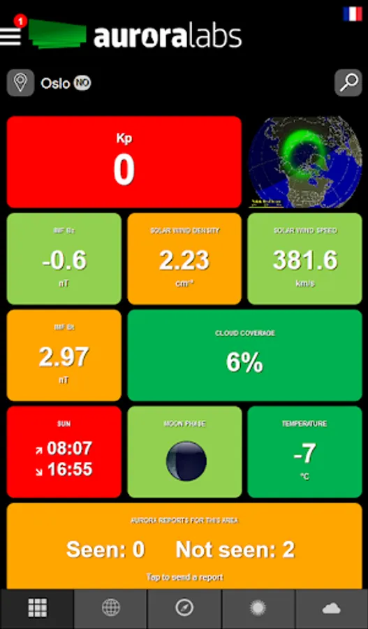 Now it’s possible to choose a location or to even geolocalise yourself, in order to find out the current weather and auroral conditions in your area and to determine if it’s possible to see the Aurora! Now it’s very easy and fun to see if you should go out (or not) to hunt the Northern Lights, thanks to the colour coded tiles in the app! And no, you don’t need to know what is Bz, Kp, Bt, …