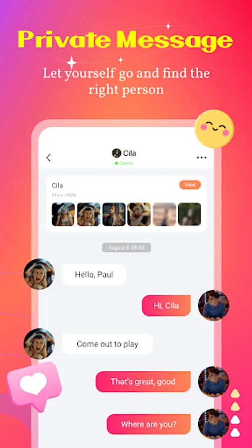 It may be your new start of a romantic relationship.By joining Mego, you never have to worry that you won't find active users here. No matter what kind of pure dating partner you want, there is always the like-minded person waiting for you on the online dating app to start on an adventurous local dating journey.If you find your love, “private chat” is recommended.