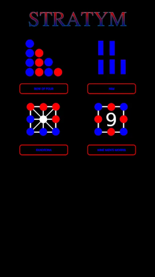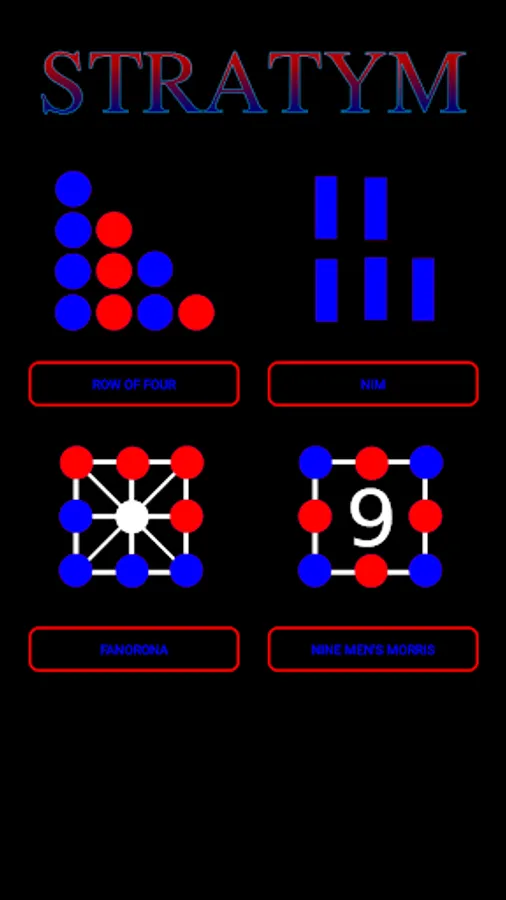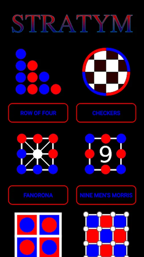 Stratym is a collection of local 2 player strategy games including Row of Four, Checkers, Tic-tac-toe, Nim, Reversi, Dots and Boxes, Chess, Konane, Fanorona, and Nine Men's Morris.