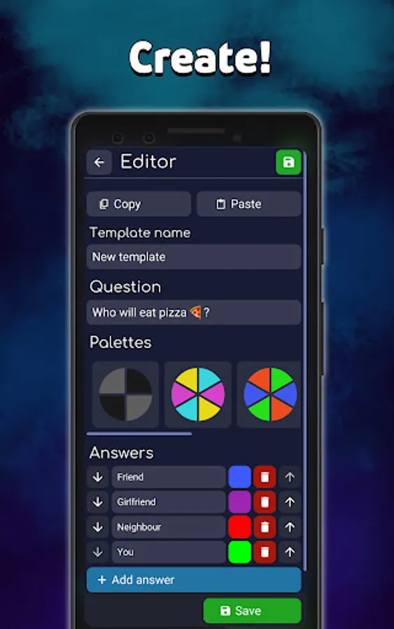 Create your own fortune wheel, spin and find out, who will eat pizza today :). With pre-built templates it is a piece of cake!
