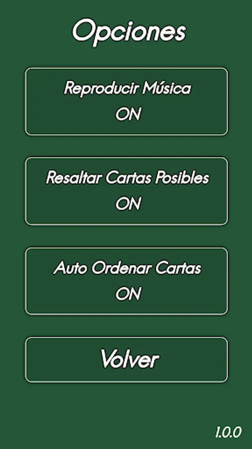 - From the options menu you can configure so that the cards are ordered automatically for the player, so that the cards that can be thrown or not are highlighted and to activate or not the music.