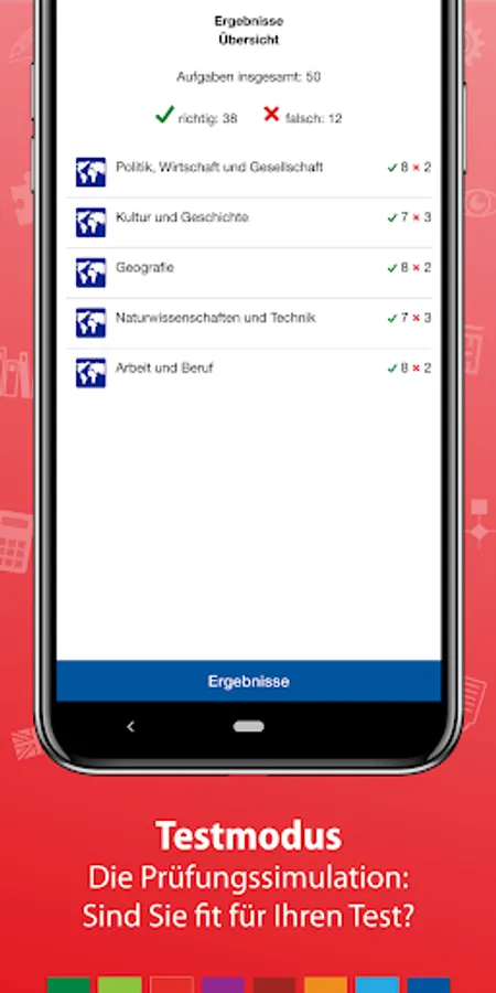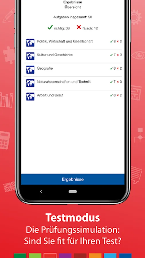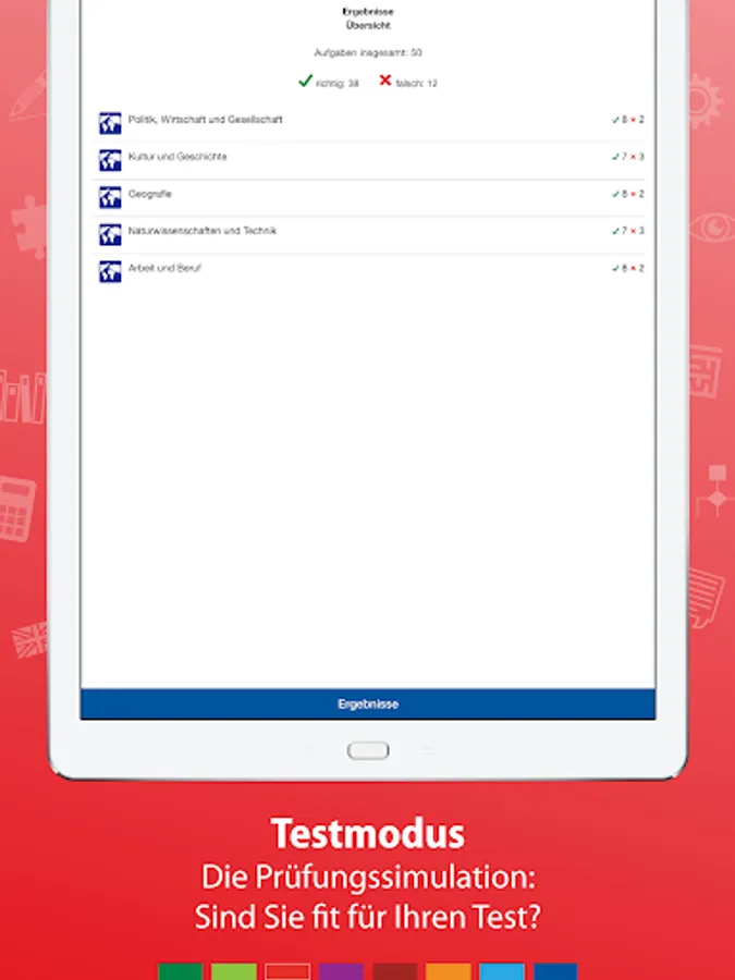 • All typical test areas: government and politics, economy and society, history, geography, PC and Internet, art and culture, mathematics, physics, technology, chemistry, biology ...