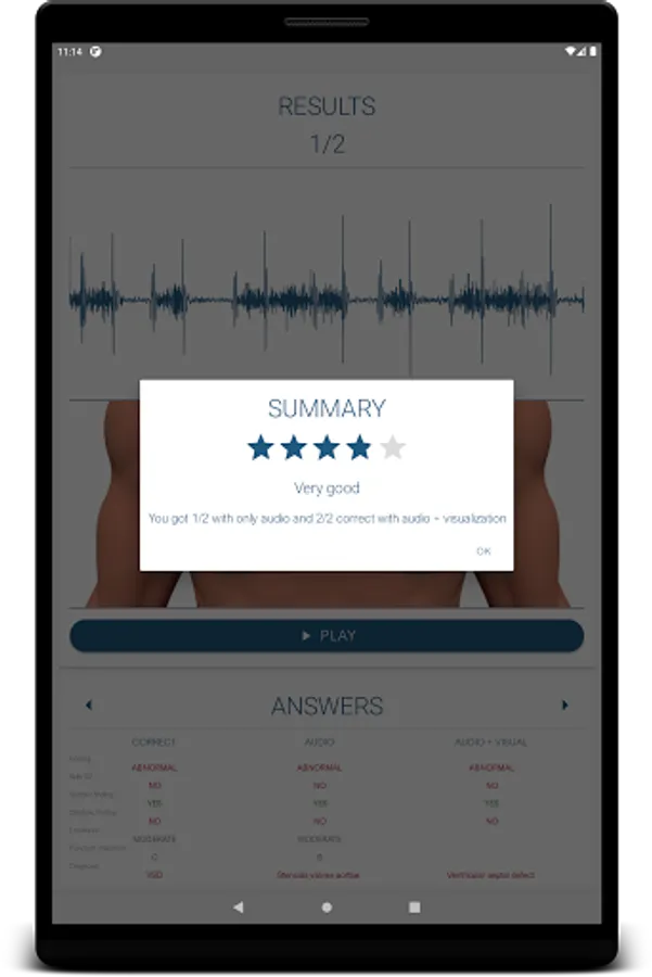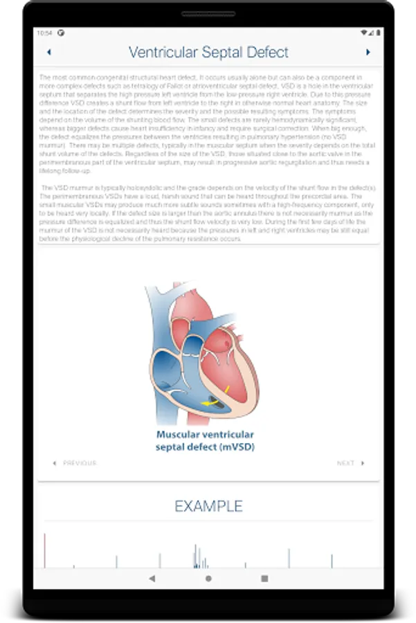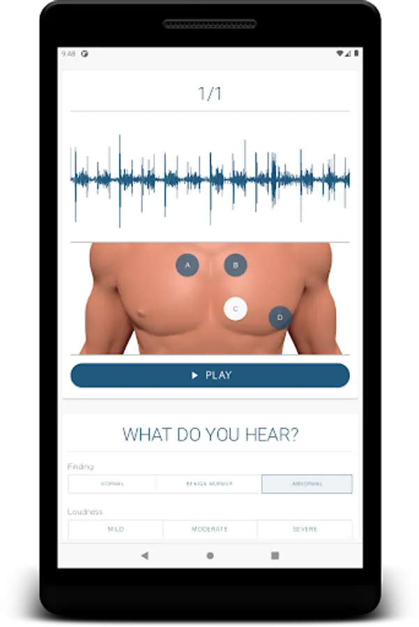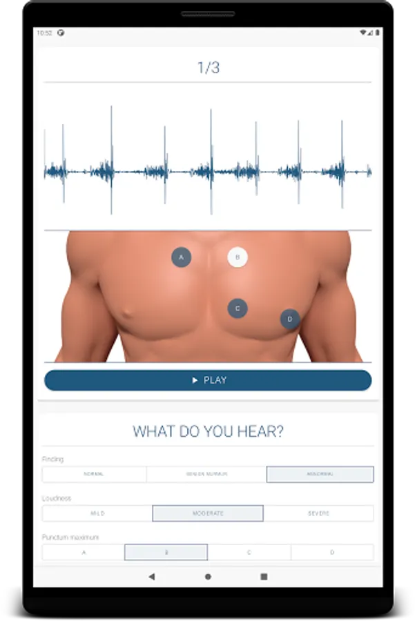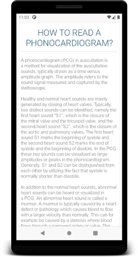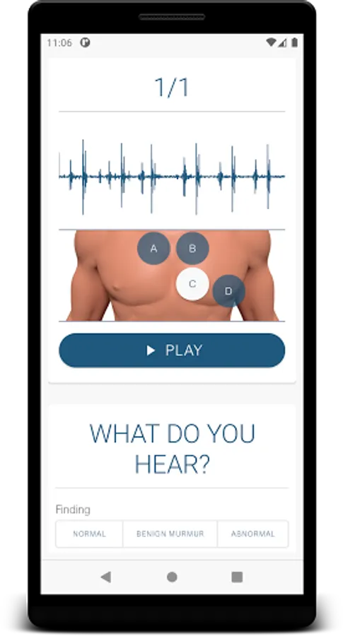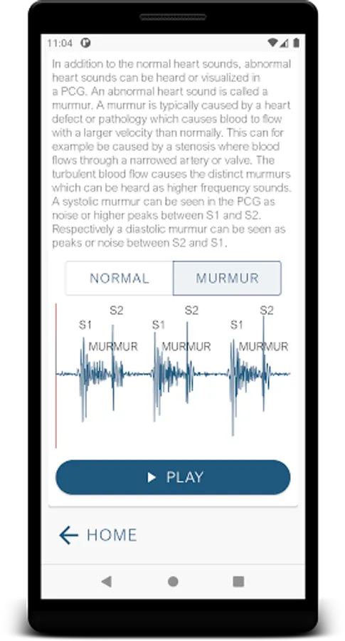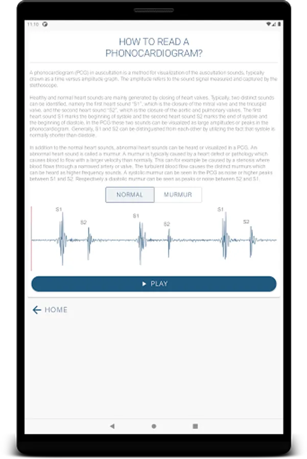 The application includes a study module for the most common defects and an extensive practice sections where you can try to diagnose the patient only by auscultation. The practice section is done with and without visual aid of a phonocardiogram signal, in order to enforce learning and understanding of the sounds. Also there is a quick start or help section for the user who is new to auscultation and phonocardiograms.