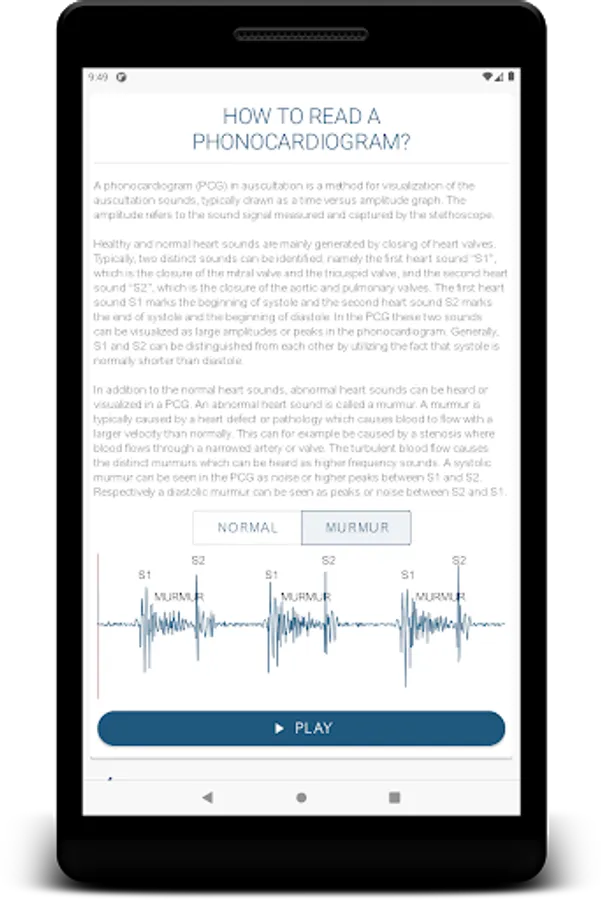 This application is intended to help medical students, doctors, nurses, medical professionals or other interested in developing their auscultation skills as well as their understanding on phonocardiograms. The application includes real heart sound recordings from over 50 paediatric patients with diagnosis validated by a cardiologist and an echocardiogram.