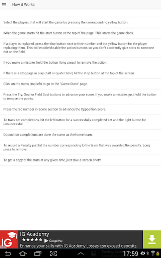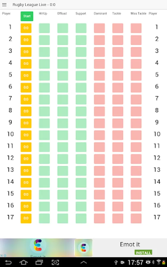 Ideally run on a Tablet device. Record the team stats like set completions and penalties. Track the performance of all the players and compare their vital statistics in the following areas;