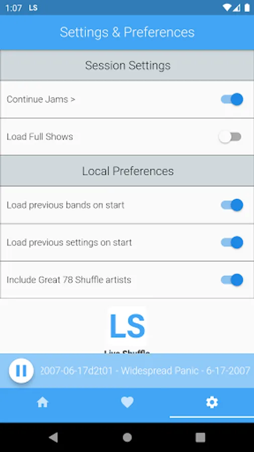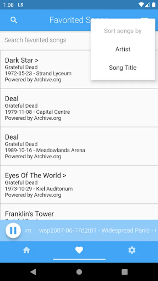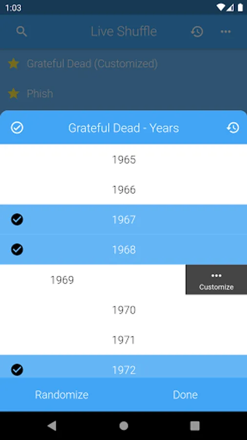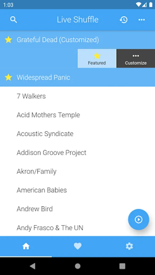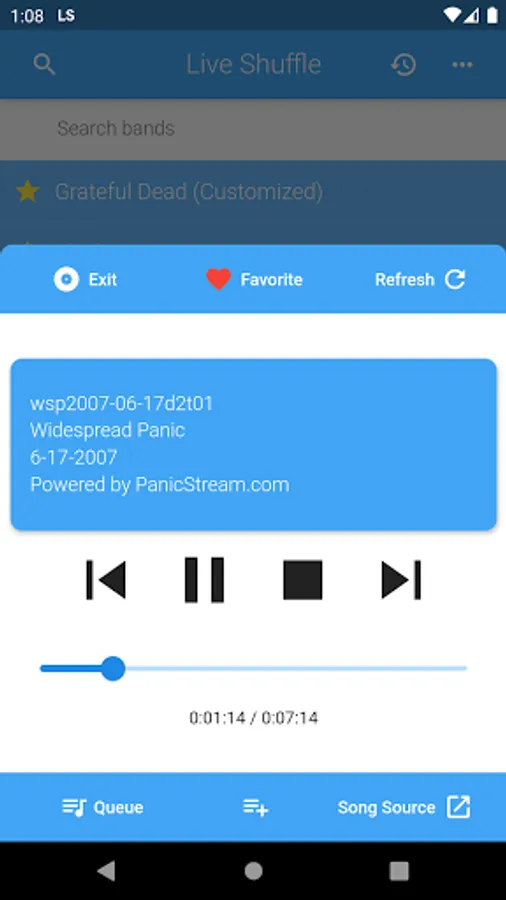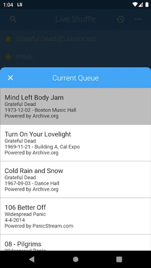 Live Shuffle is a live music shuffling app that plays music from Archive.org, Phish.in, and PanicStream.com from however many and whichever bands you might want to play music from! Sometimes committing to an entire show is daunting, which is also the case for listening to new artists instead of usual favorites. This app aims to tackle that issue by allowing people to stream whichever artists they want that are included in the app.