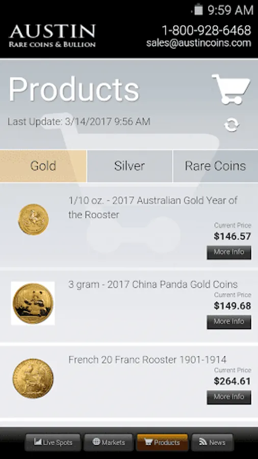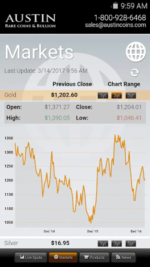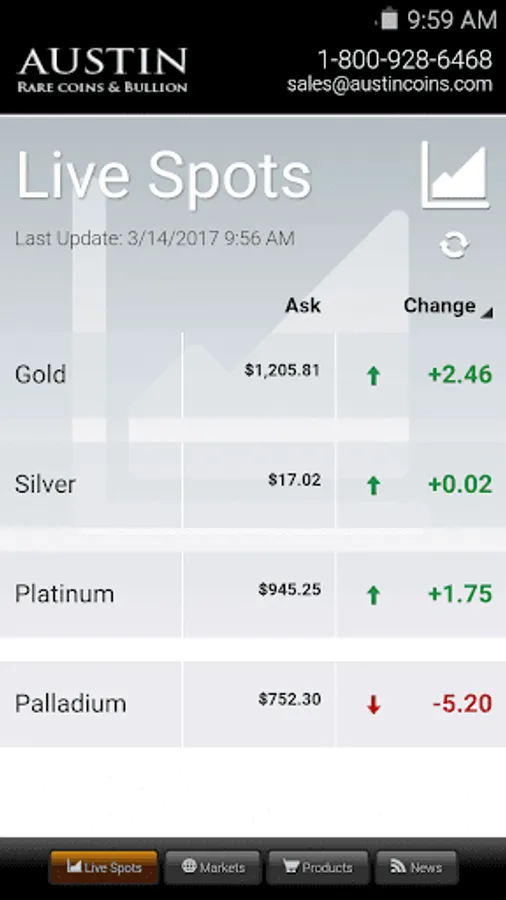 Market Tracker is designed to be a robust and evolving application that will include regular updates and increased functionality and access to information. Users can simply click on the Austin Rare Coins and Bullion phone number located at the top of each page within Market Tracker to be connected with a courteous, investment professional, who can answer any questions you have or assist you with your purchase of gold, silver, and rare coins. ARCI will also provide special pricing offers exclusive to Market Tracker users, so download the FREE app today!