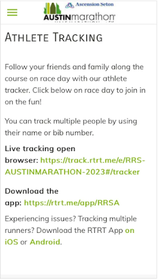 The Official app of The Ascension Seton Austin Marathon®. It includes a wide range of features that provide runners, volunteers and spectators with important and fun information relating to the event: