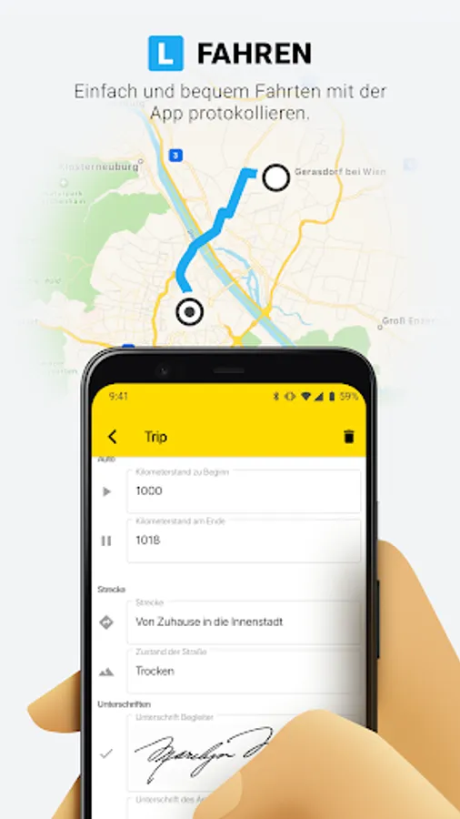 + The saved data and the progress status can be viewed at any time. The people involved in the training trip (applicant / accompanying person) can sign directly on the smartphone. At the end an L17 trip log can be printed out. The logbook or trip log is designed strictly according to the legal requirements.