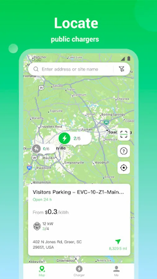 • Displays the availability status of public chargers on the map. (available, in-use, out of order, etc.)