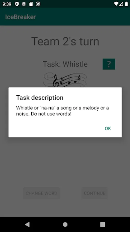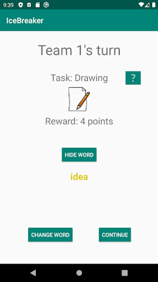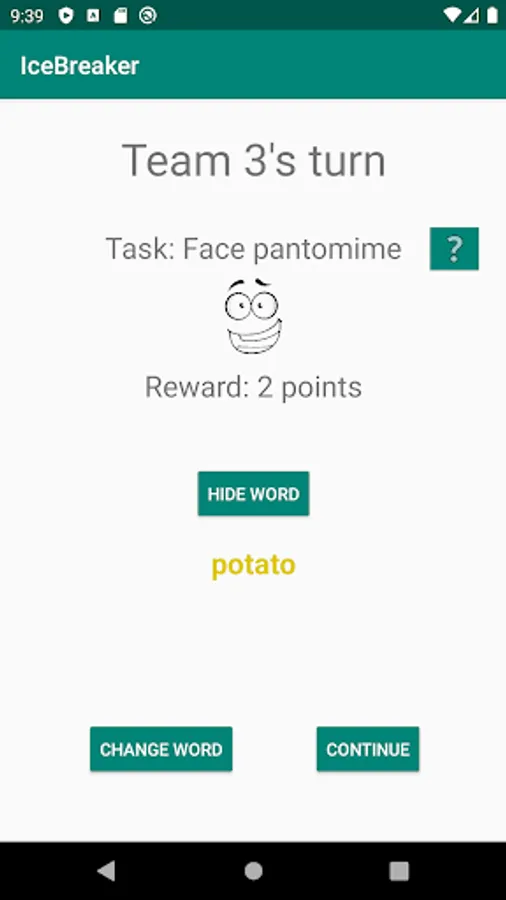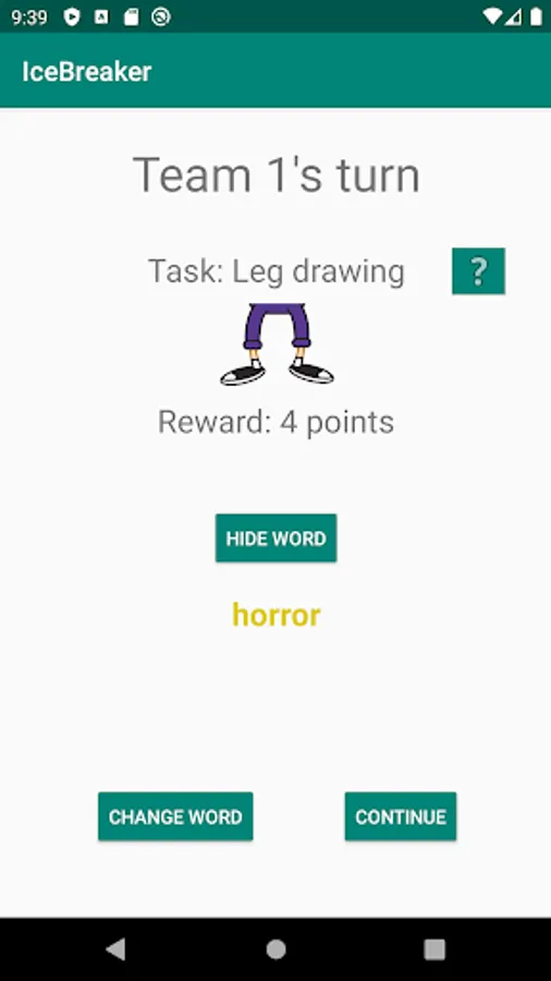 The word representation is performed by specified task e.g. drawing, face pantomime, whistling… Each player can change his word maximum 3 times, but the reward will be decreased after each word change.
