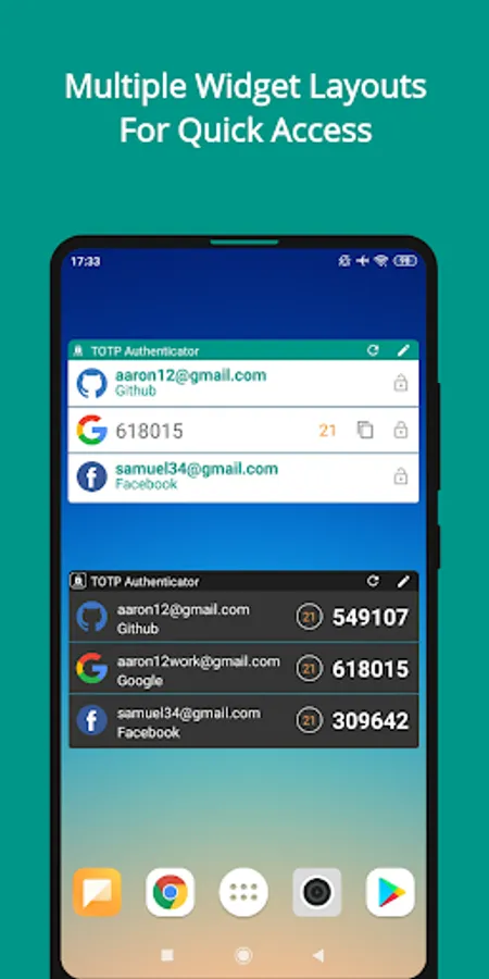 With TOTP Authenticator, you can easily add multiple widgets for your favourite accounts on the home screen for quick access. These widgets come in multiple layouts, so you can choose whichever suits you the best.