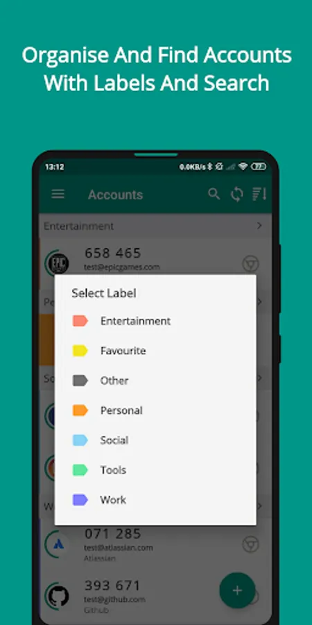 The app allows you to set unique icons to your accounts, either by selecting icons from the provided list or by uploading them. This helps you to easily recognize and sort your accounts.