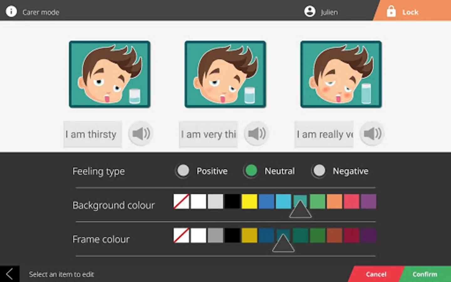 iFeel™ is an application that expresses needs, emotions and feelings through pictograms and voice recordings on a tablet.