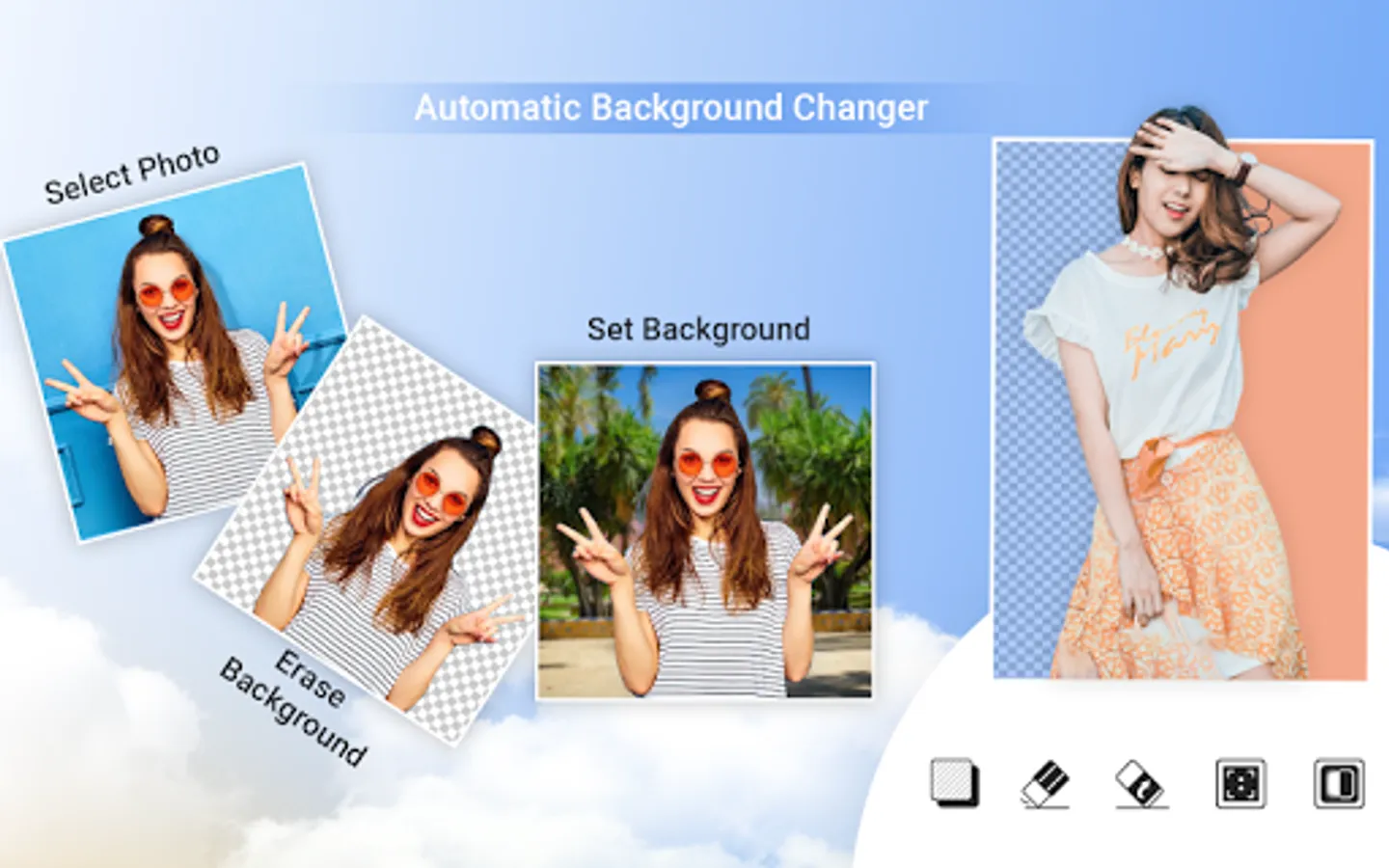 This app is an automatic background changer. You can cut out background from any photo and change the background of your photo. Background eraser can automatically remove background from photos or you can use eraser tool for photos to erase objects from photos by yourself.