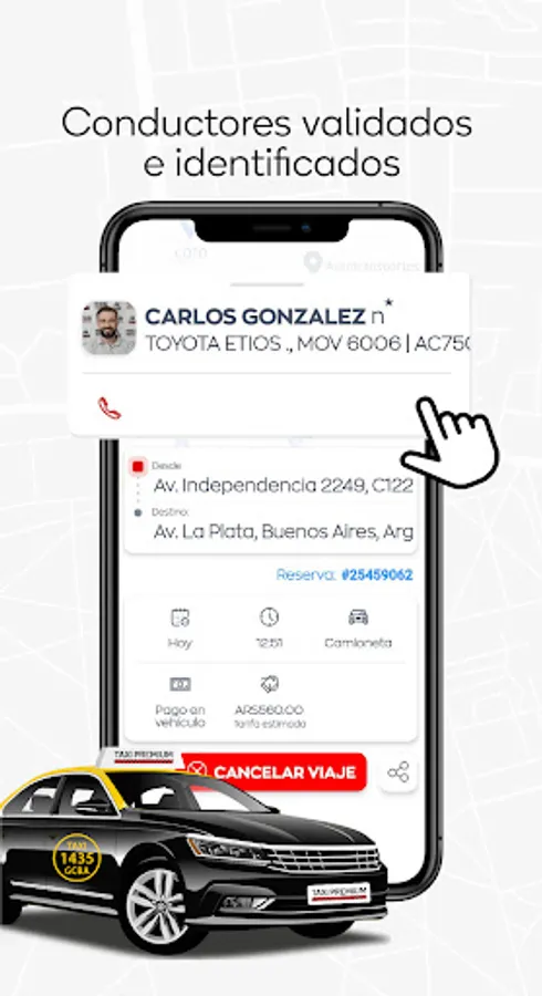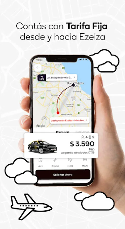 Receive a notification when the taxi is at your door, board and travel to your destination.