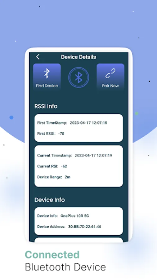 in a Bluetooth-related application or tool can scan for nearby Bluetooth devices and provide information about their signal strength, name, distance, address, and RSSI (Received Signal Strength Indicator) instantly after scanning.*