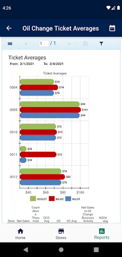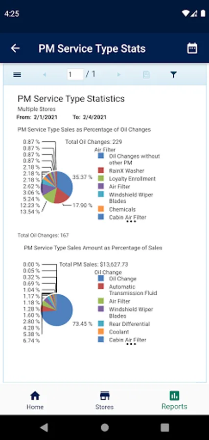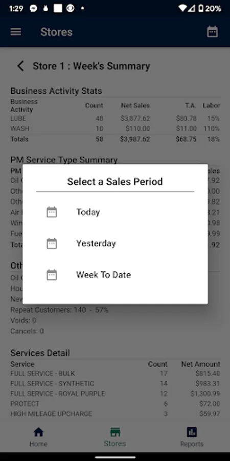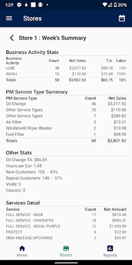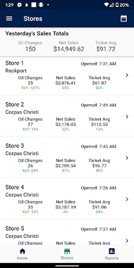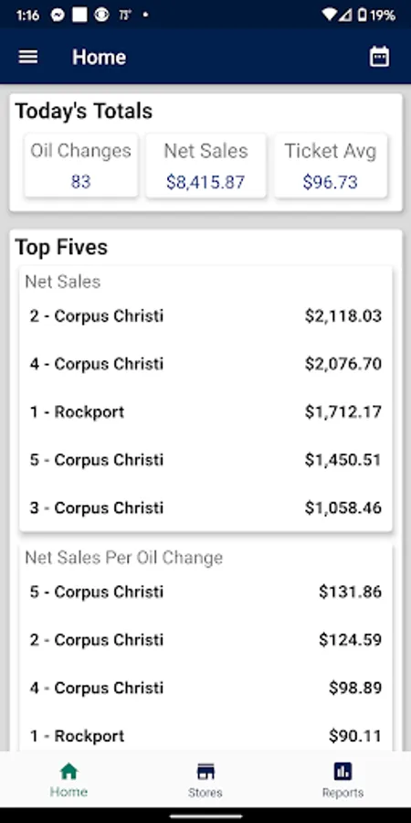 * Top Five stores shown on home screen for net sales, oil changes, and ticket average.