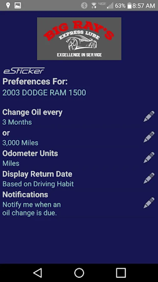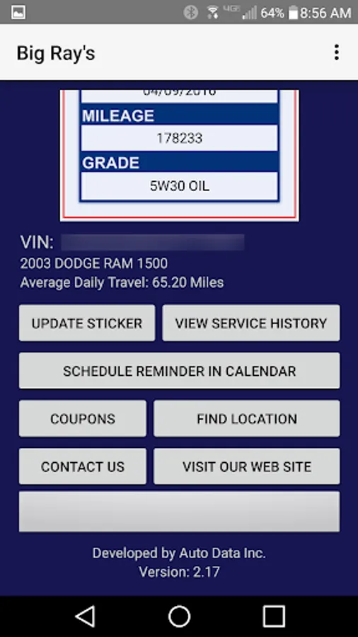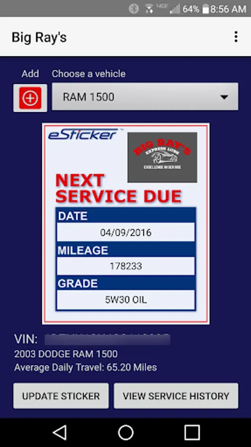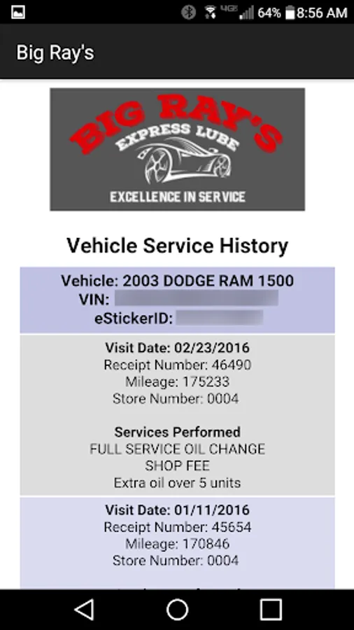 The eSticker app also lets you view a history of all services performed on your vehicles by Big Ray's Express Lube at any time, so you'll always know which services have been performed on each of your vehicles, and when they were last performed.
