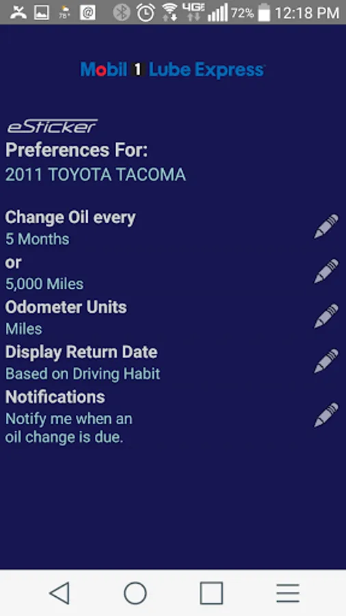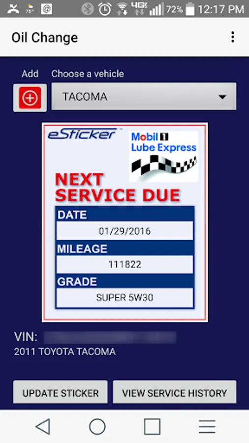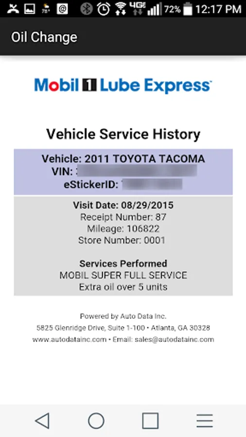 The eSticker app also lets you view a history of all services performed on your vehicles by Athens Mobil 1 Lube Express at any time, so you'll always know which services have been performed on each of your vehicles, and when they were last performed.