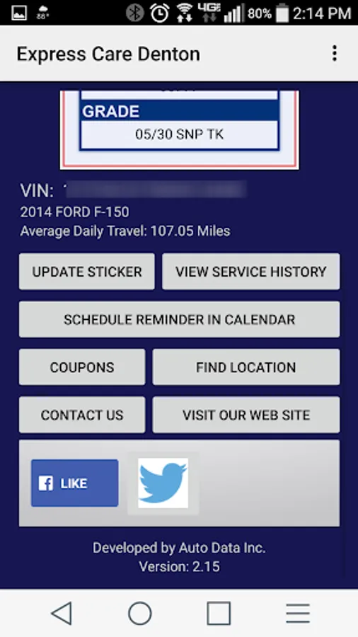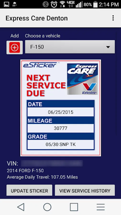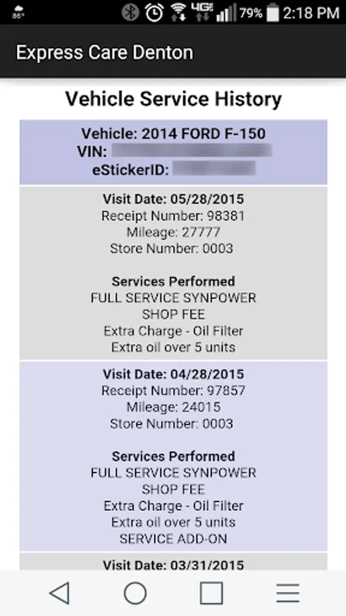 The eSticker app also lets you view a history of all services performed on your vehicles by Express Care Denton at any time, so you'll always know which services have been performed on each of your vehicles, and when they were last performed.