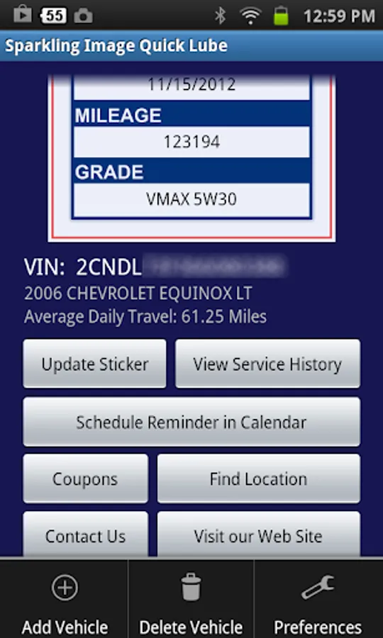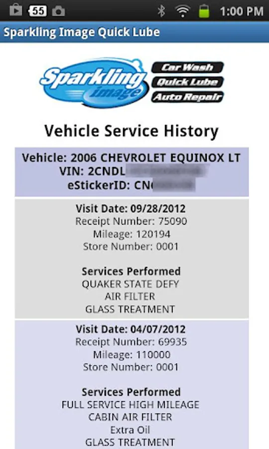 The eSticker app also lets you view a history of all services performed on your vehicles by Sparkling Image Quick Lube at any time, so you'll always know which services have been performed on each of your vehicles, and when they were last performed.