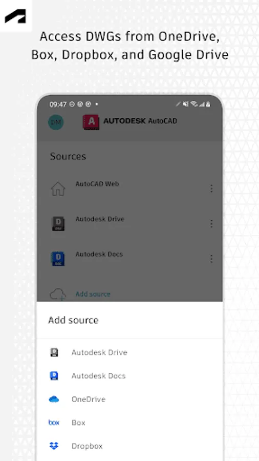 • Simplify workflows by opening DWG files directly from Autodesk Drive, Autodesk Docs, Microsoft OneDrive, Box, Dropbox, or Google Drive.