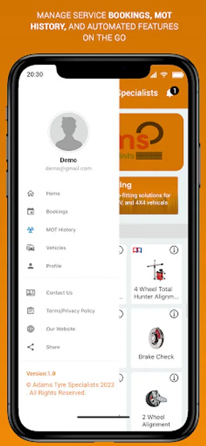 Track your MOT certificate and deadlines coming your way in one click. Get pop-up notifications for your MOT appointments and up-gradation of the vehicle. Explore through the app and find the ideal tyres from several tyre brands available for vehicles of all types in different sizes. Simply add the product or the service you wish to get in the service cart and get an overview of the prices then and there. You can also review your cart, service or product history and track other services through this app. Download the app now to avail exciting offers and great deals waiting for you in the Adams Tyre Specialists app.