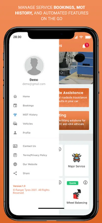Track your MOT certificate and deadlines coming your way in one click. Get pop-up notifications for your MOT appointments and up-gradation of the vehicle. Explore through the app and find the ideal tyres from several tyre brands available for vehicles of all types in different sizes. Simply add the product or the service you wish to get in the service cart and get an overview of the prices then and there. You can also review your cart, service or product history and track other services through this app. Download the app now to avail exciting offers and great deals waiting for you in the Ranger Tyres app.