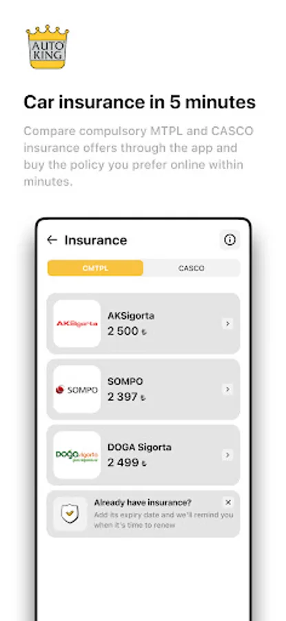 Your car insurance policy in your smartphone — add insurance details, and we will remind you when to renew it. Compare insurance quotes for MTPL and CASCO on your mobile and buy online within minutes.