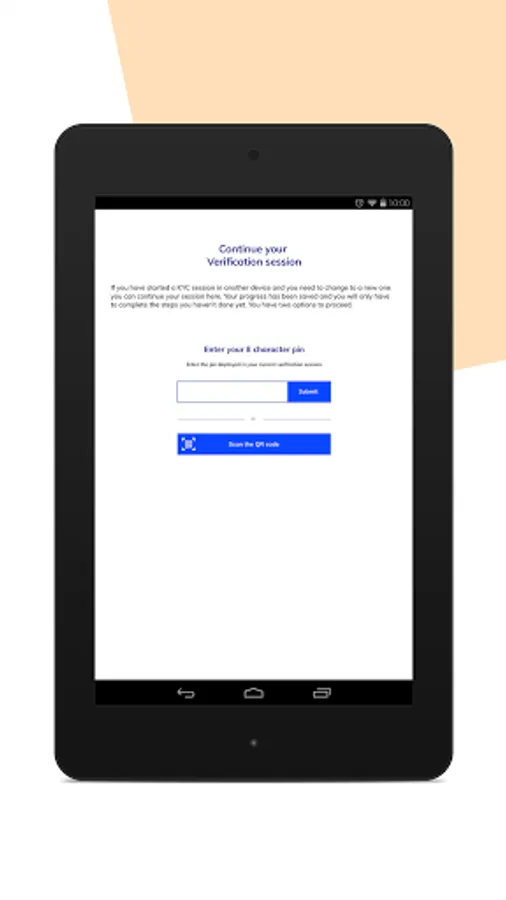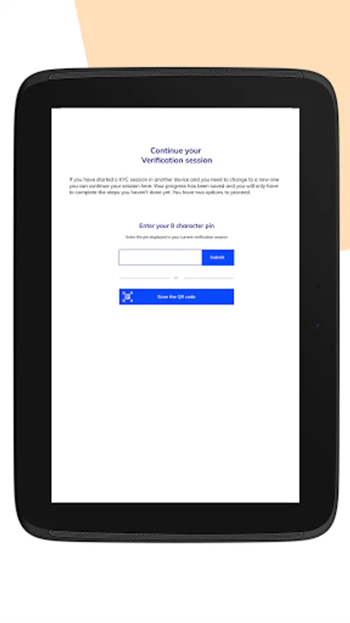 Customers can continue their verification session on a different device to utilize better camera quality and/or more comfortable input. For example, your client can start the verification procedure by filling the questionnaire on their computer and finish it on their mobile phone, taking a photo of their document and a selfie.