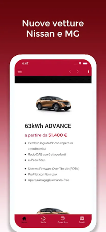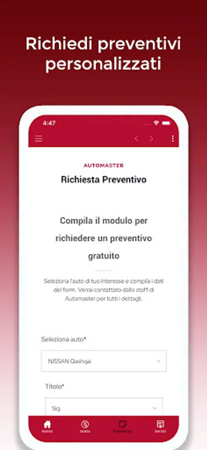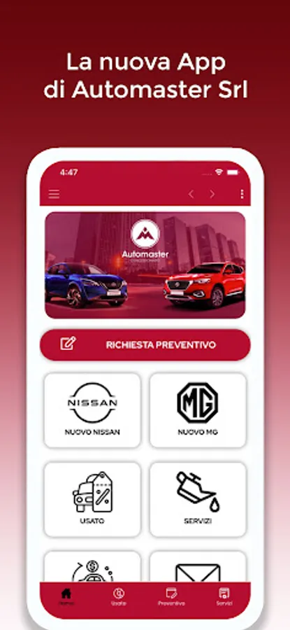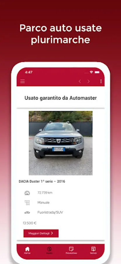 Con l'app ufficiale di Automaster srl potrai visionare il parco macchine usato, in continuo aggiornamento giornaliero, vedere tutti i servizi che offriamo ai nostri clienti e richiedere assistenza, preventivi o consulenze in qualsiasi momento. A breve saranno disponibili anche molte altre funzionalità avanzate!