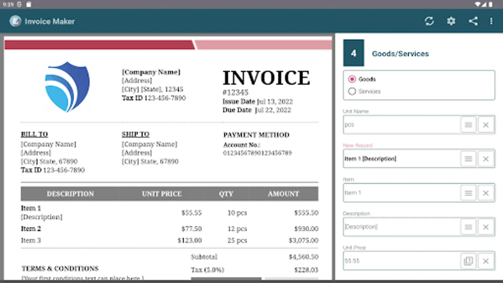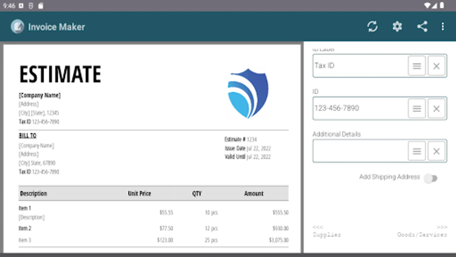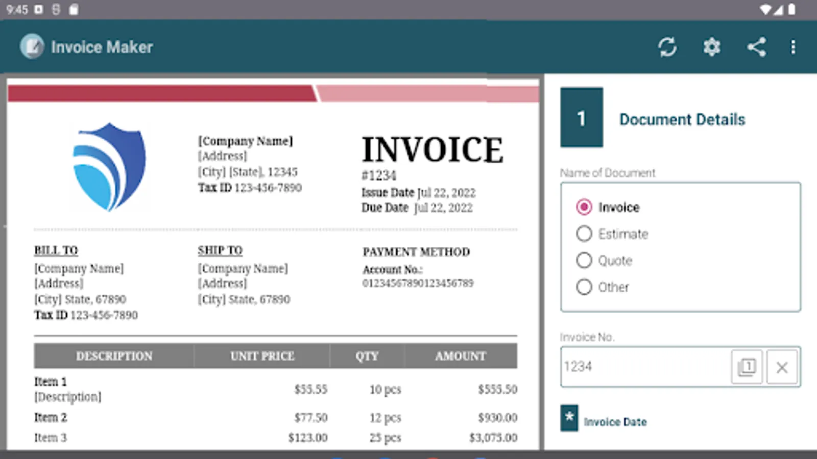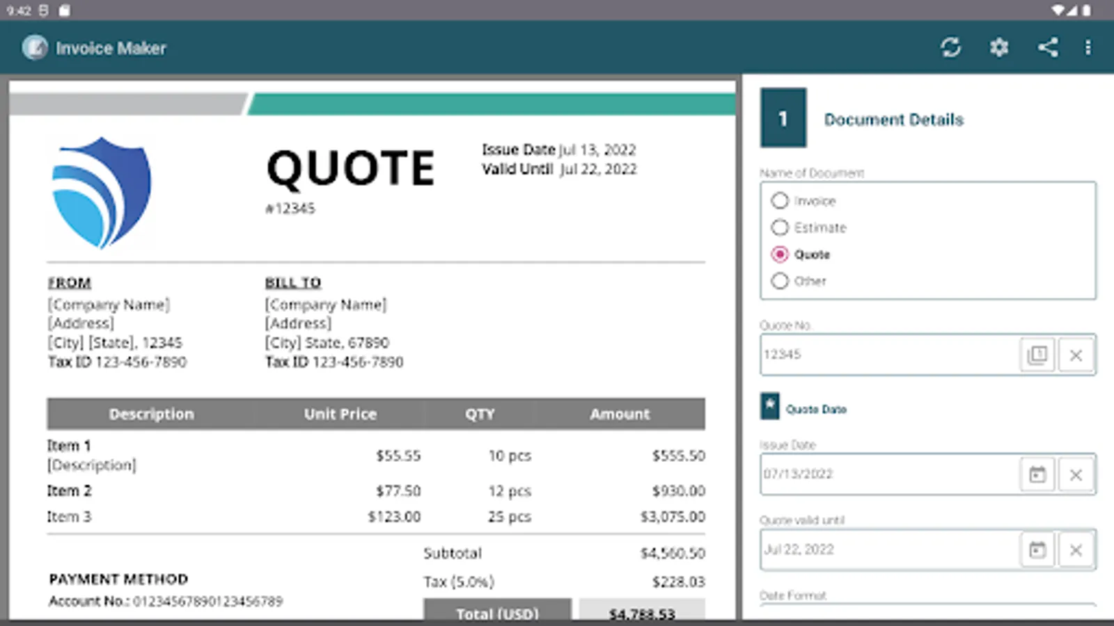 The Invoice Maker App allows to prepare both sales invoices and service Invoices, so as Estimates and Quotes or Quotations for services on base of automated invoice template form. Fast invoice generator creates estimates, quotes, quotations and invoices in couple of minutes with real-time preview during invoice creation process. Users can change the name of the invoice, save all vendors and clients, goods and services details in database, customize fields and labels of the document.