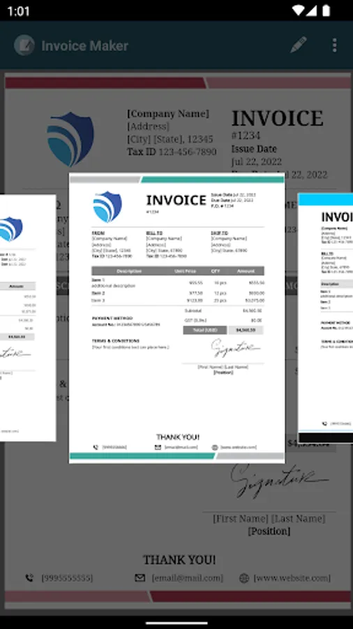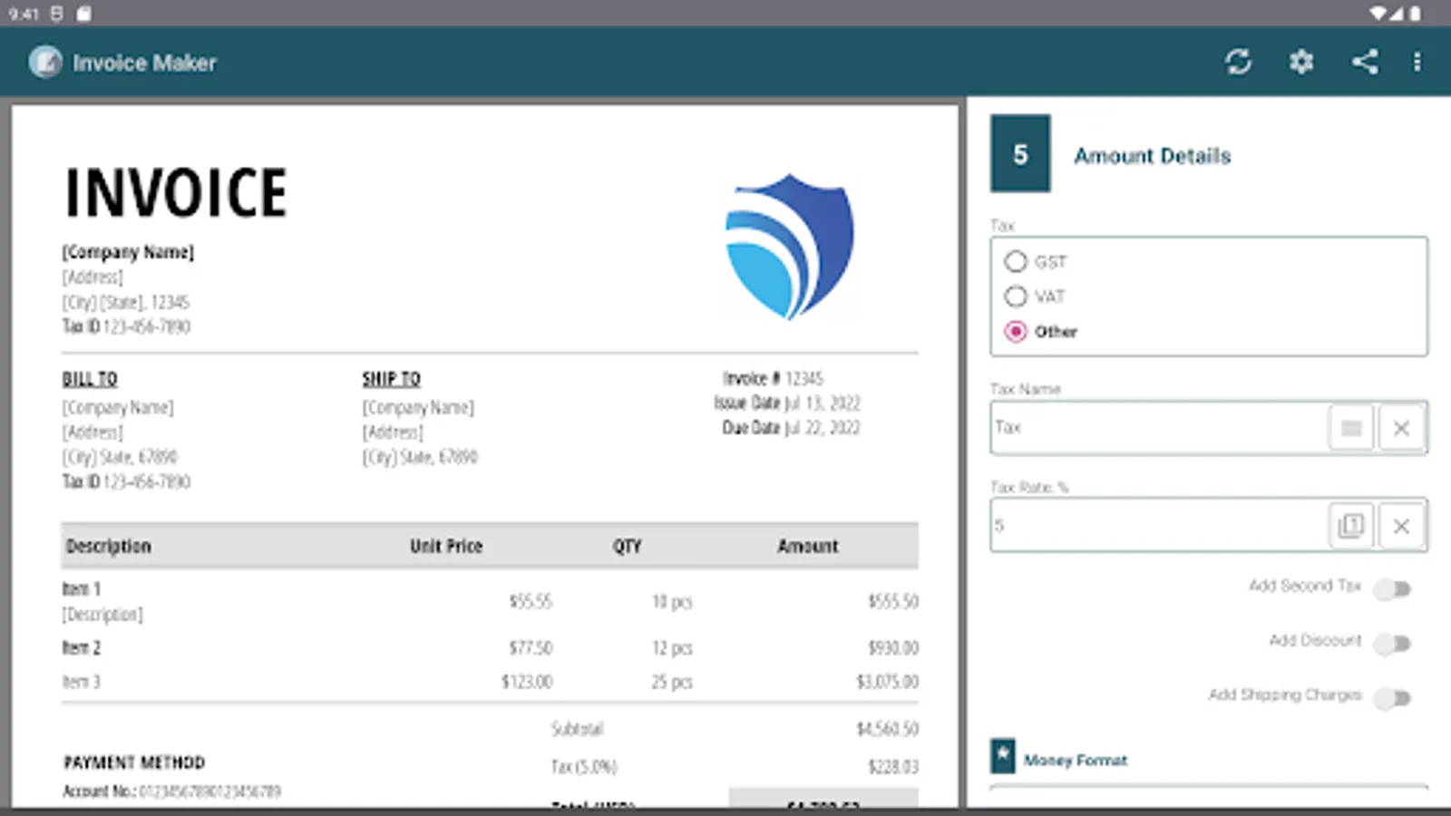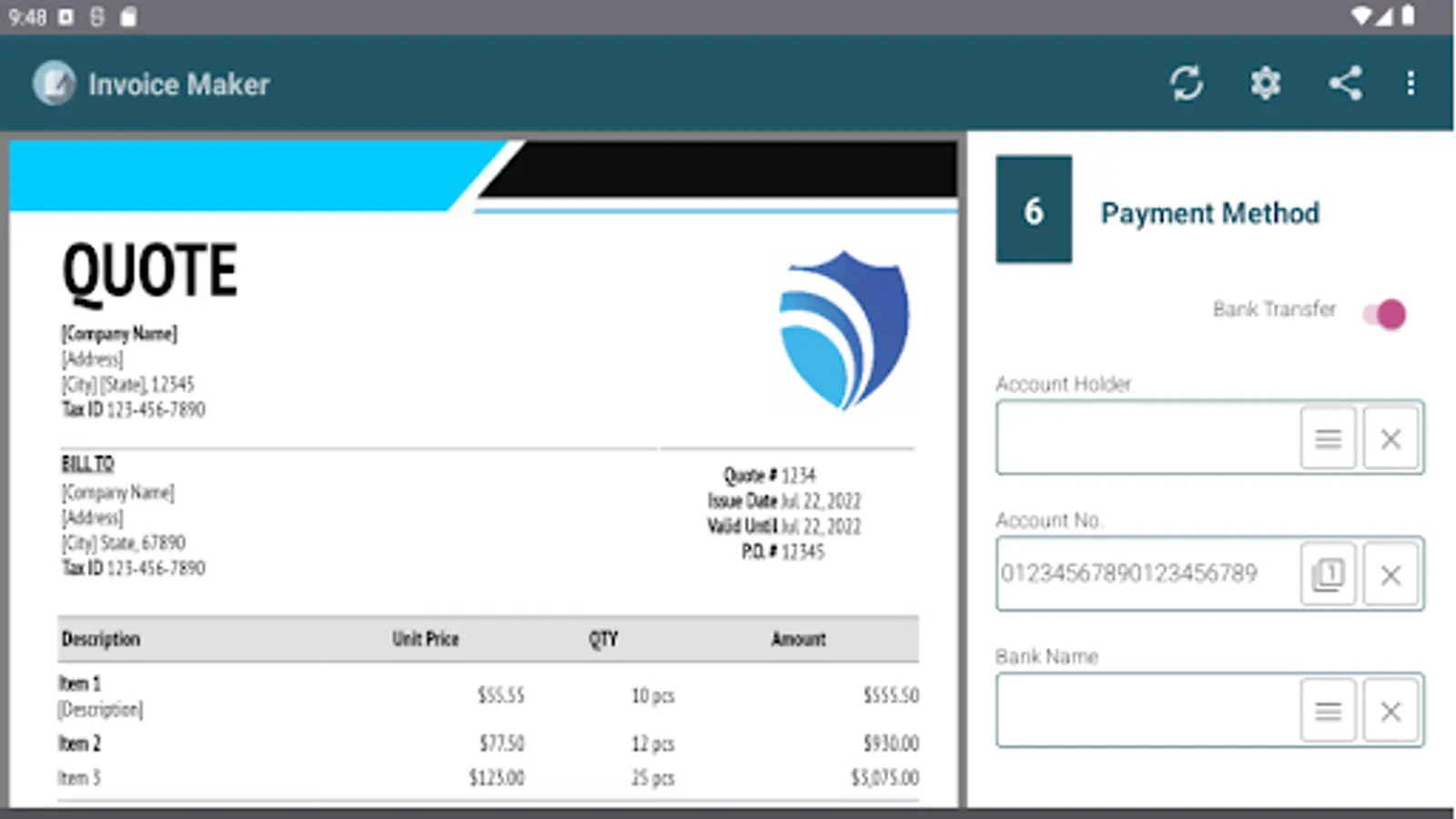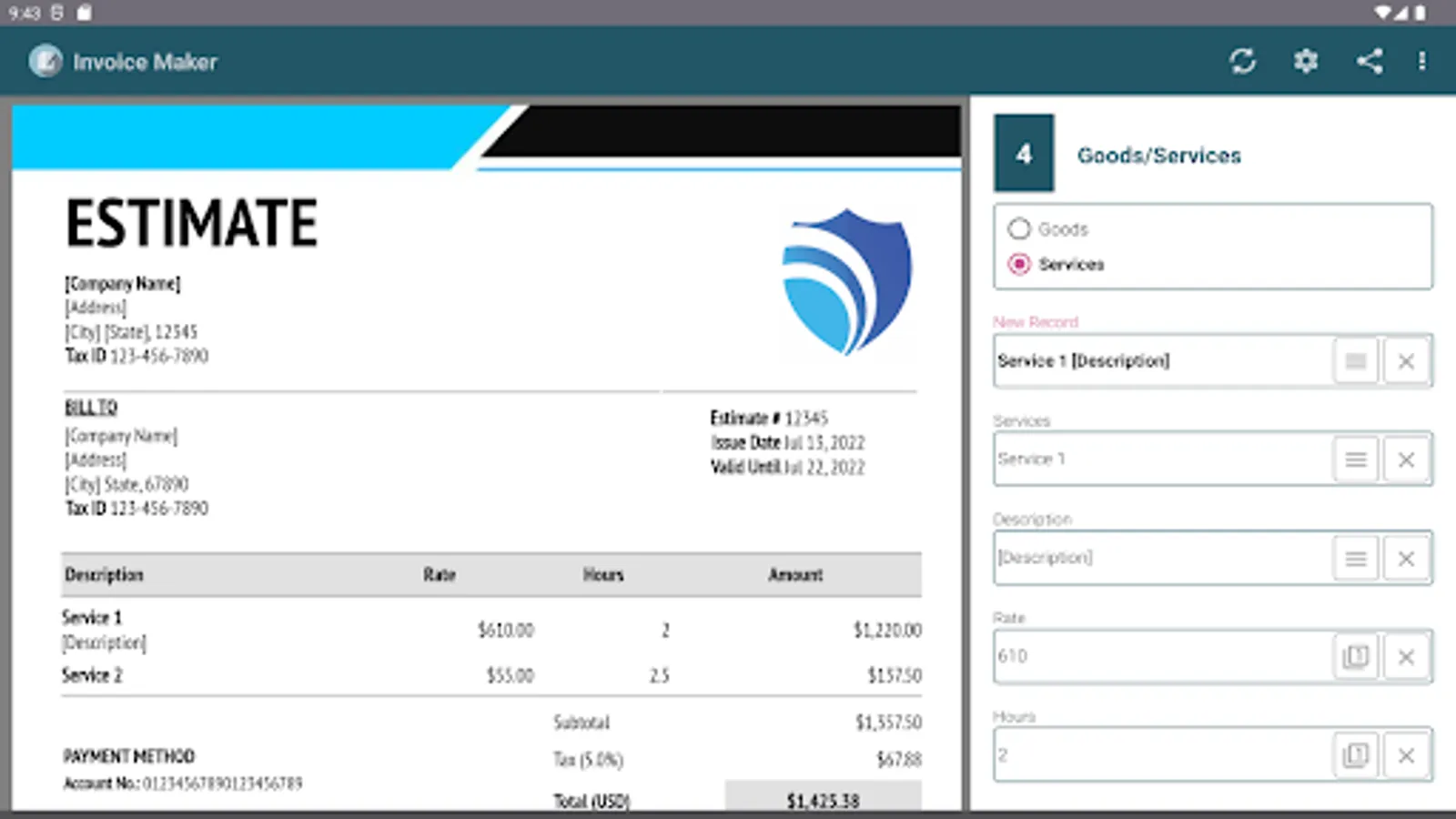 The Invoice Maker App allows to prepare both sales invoices and service Invoices, so as Estimates and Quotes or Quotations for services on base of automated invoice template form. Fast invoice generator creates estimates, quotes, quotations and invoices in couple of minutes with real-time preview during invoice creation process. Users can change the name of the invoice, save all vendors and clients, goods and services details in database, customize fields and labels of the document.