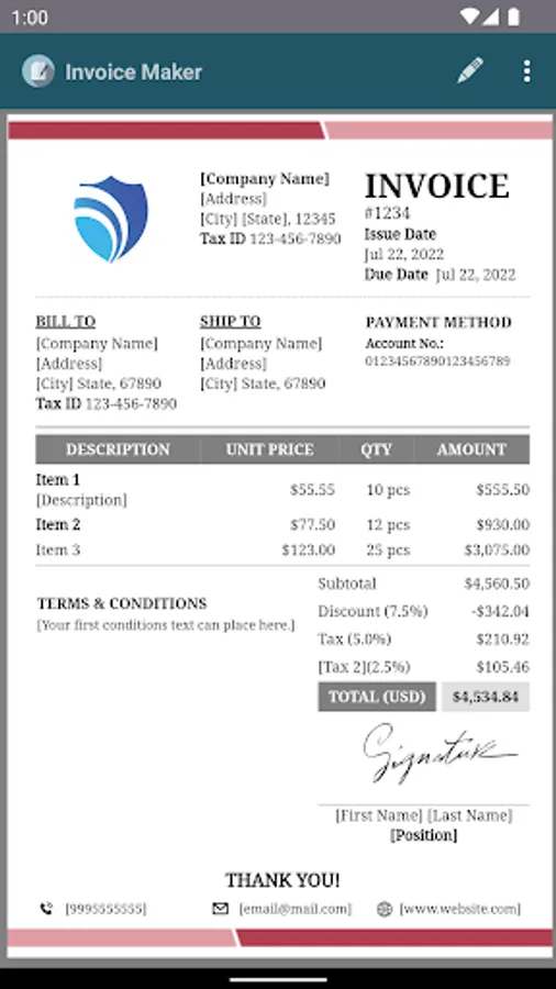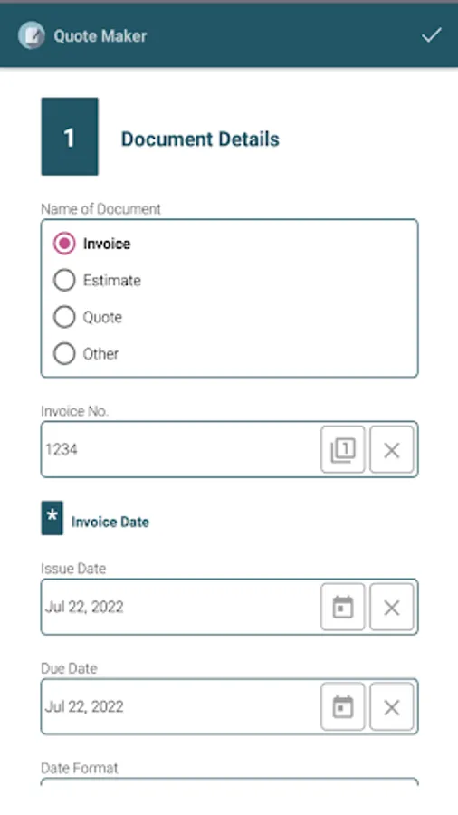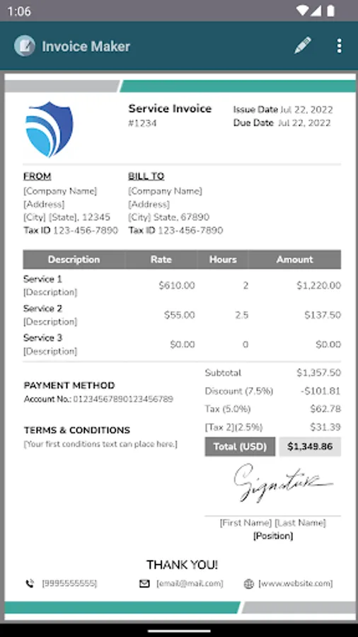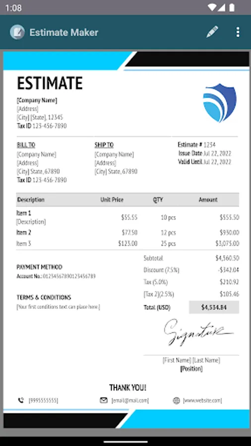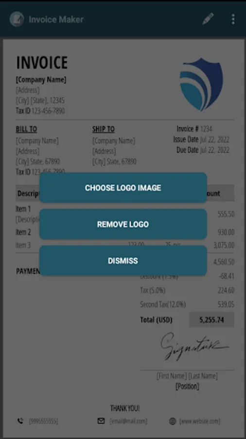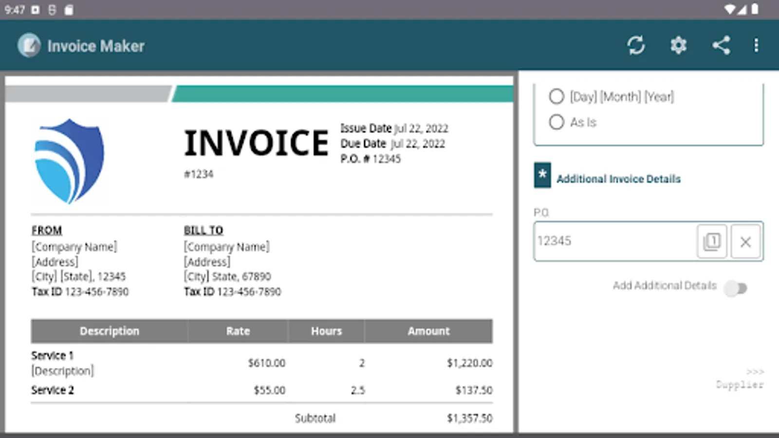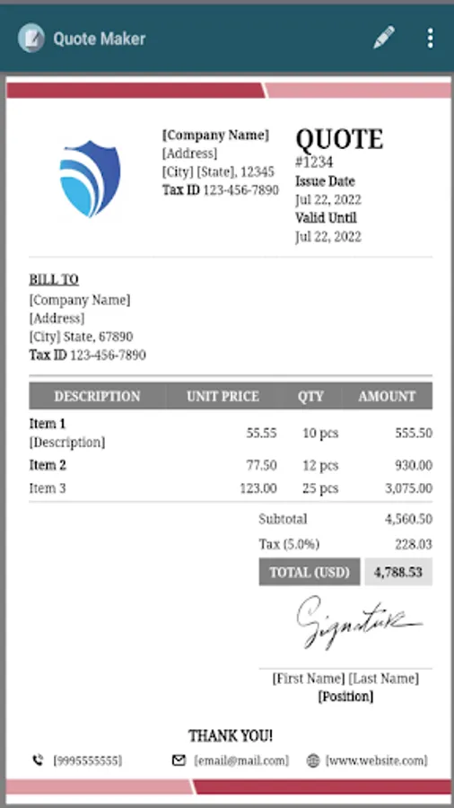 The Invoice Maker App allows to prepare both sales invoices and service Invoices, so as Estimates and Quotes or Quotations for services on base of automated invoice template form. Fast invoice generator creates estimates, quotes, quotations and invoices in couple of minutes with real-time preview during invoice creation process. Users can change the name of the invoice, save all vendors and clients, goods and services details in database, customize fields and labels of the document.
