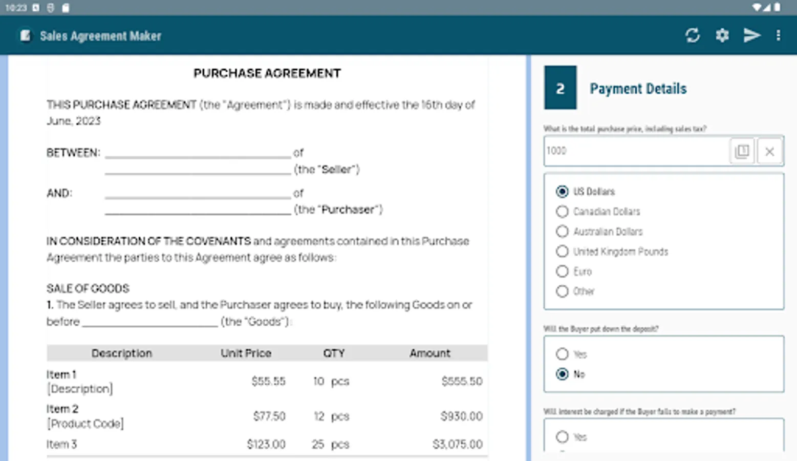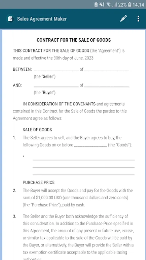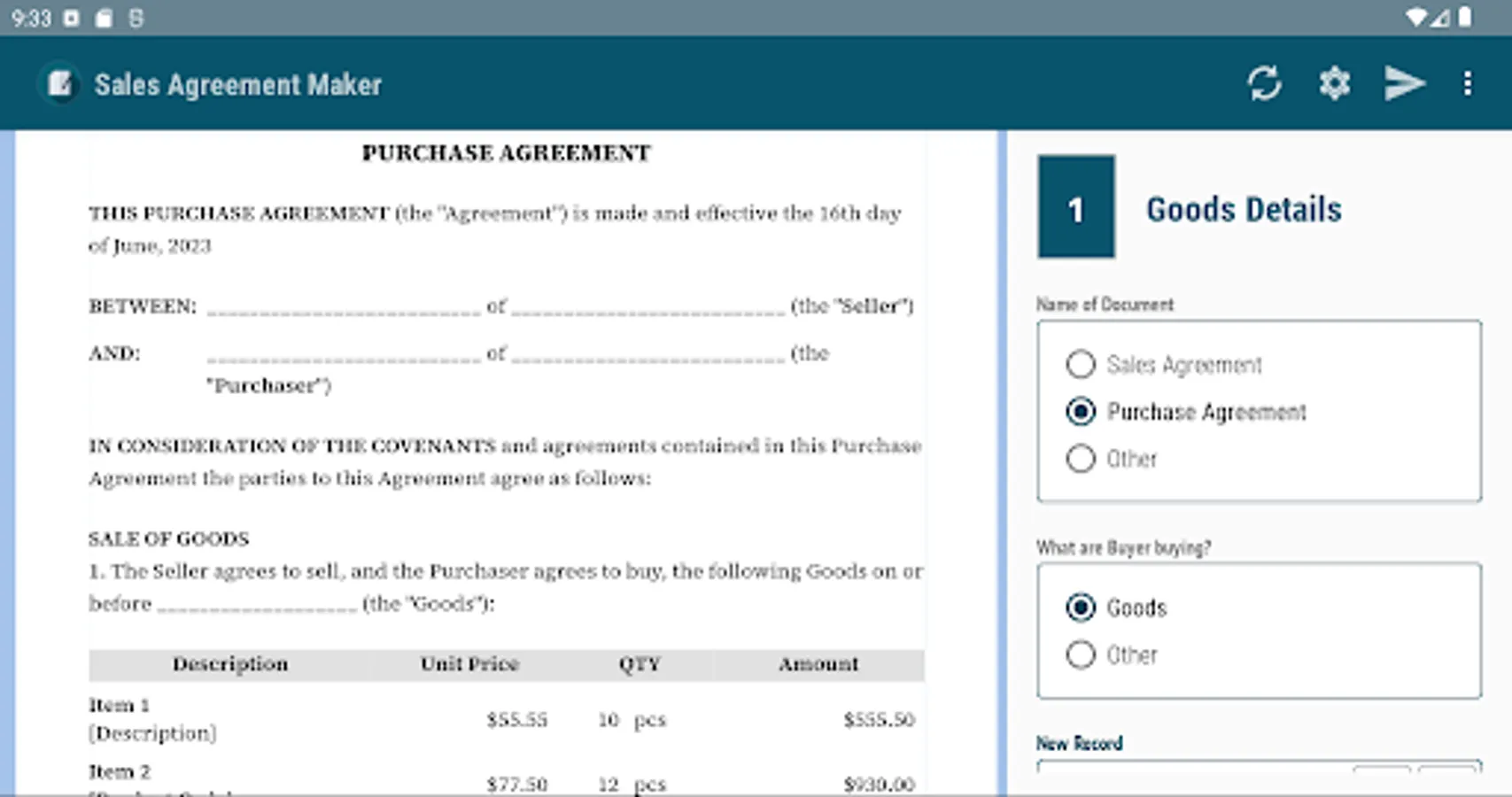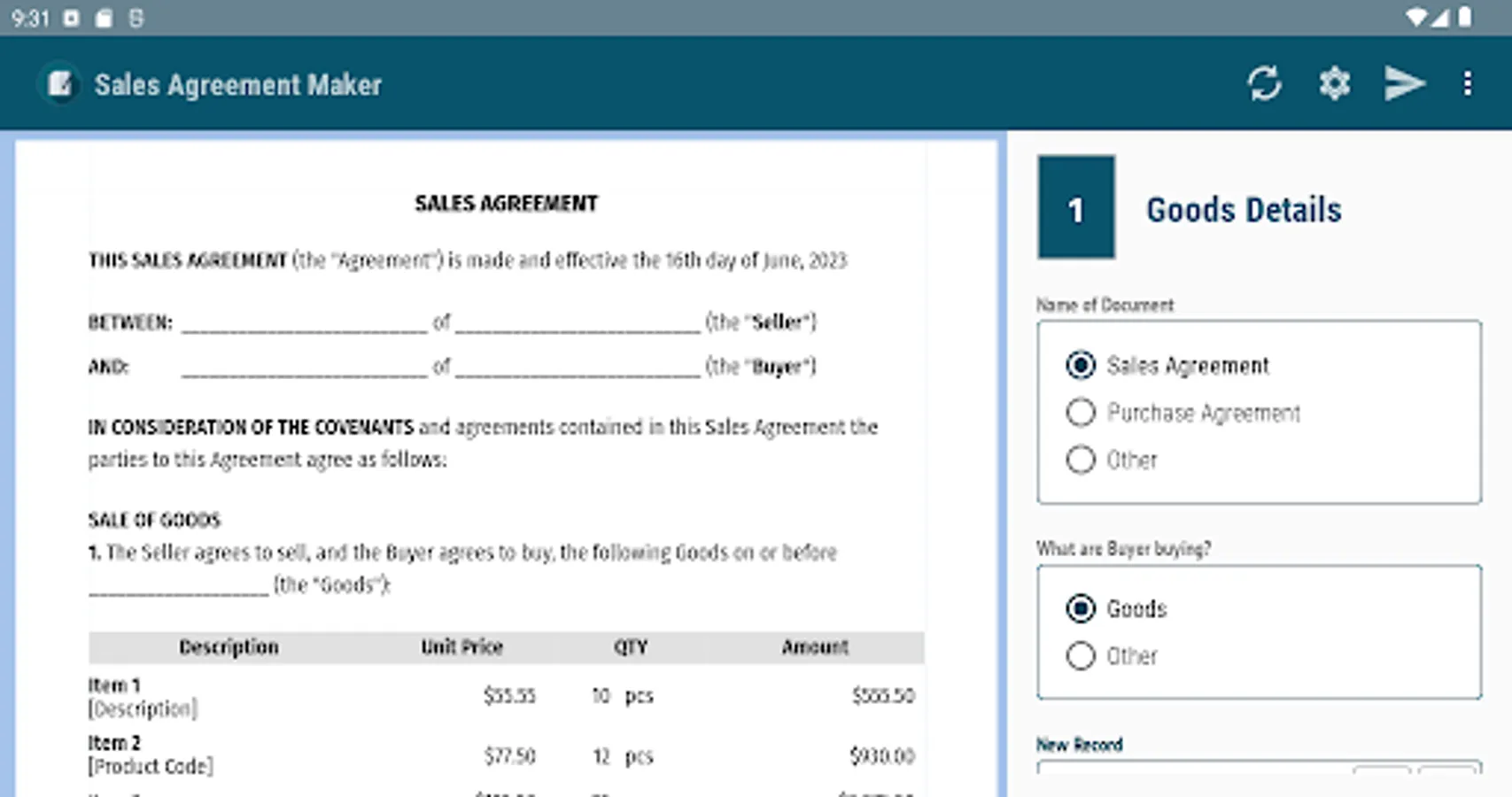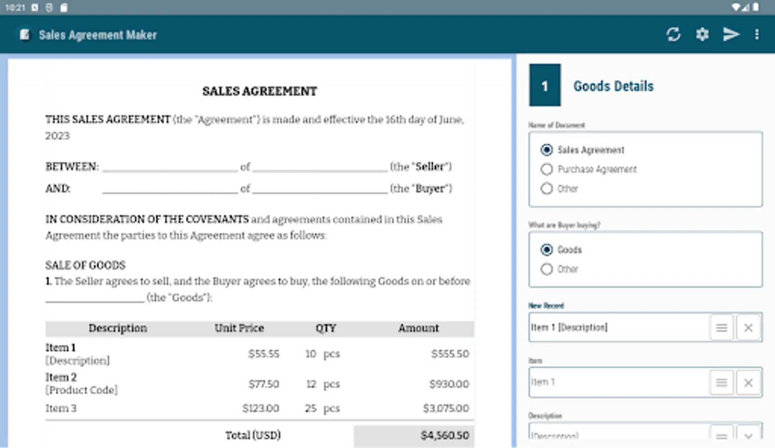 The Sales Agreement App uses the automated agreement form (contract template) for drawing the Sales Agreement or Purchase Agreement forms. This Sales Contract or Sale of Goods Contract application allows a seller or a buyer (purchaser) to document the sale of goods transaction. The Sales Agreement Maker automatically changes the text of the contract using a contract template in which the user selects the necessary options. The contract template saves all entered data between working sessions.